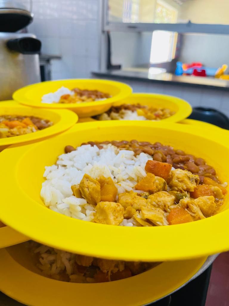 Almocinho da creche Emei Pierre Averan, cardápio do dia 10/04/2024 – Frango ao molho com legumes, arroz e feijão.