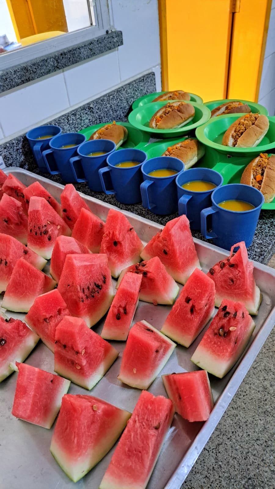 Refeição deliciosa servida no EMEF Alencar Cardoso – Cachorro quente de carne moída, suco e uma frutinha deliciosa. EMEF Alencar Cardoso.